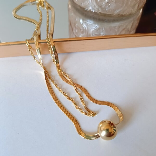 Κόσμημα αποτελούμενο από δύο αλυσίδες σε διαφορετικό μήκος, μία φίδι και μία πλεκτή ιδιαίτερα λαμπερή και κρεμαστό μπίλια