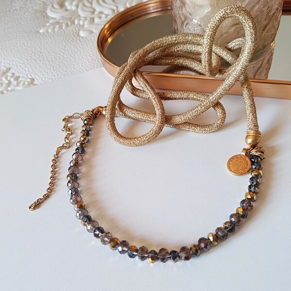 Κορδόνι με μεταλλική χρυσή κλωστή , κρυστάλλινες χάντρες και φλουρί ,το οποίο περιστρέφεται γύρω από το λαιμό και δημιουργεί ένα φαρδύ τσόκερ