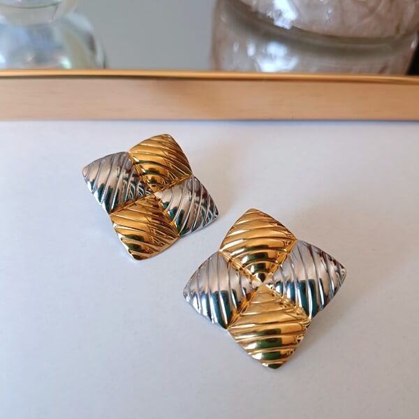 Σκουλαρίκια σκαλιστά από ανοξείδωτο χάλυβα με καρφάκι , σε συνδυασμό ασημί και χρυσό .Πολύ ανθεκτικά, δεν σκουριάζουν