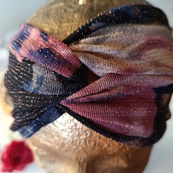 Χειροποίητη εμπριμέ πολύ ελαστική κορδέλα με χρυσόσκονη από lurex ύφασμα. Η χρυσή σκόνη δε φεύγει με το πλύσιμο! Όλες οι χειροποίητες κορδέλες μας χρησιμοποιούνται με δύο διαφορετικούς τρόπους, είτε με τη διχάλα μπροστά, είτε φέρνοντας το πίσω μέρος μπροστά έτσι ώστε να φαίνεται πιο φαρδιά και να δίνει την εικόνα τουρμπάν. Ένα μοναδικό και ξεχωριστό αξεσουάρ που προσδίδει μια πινελιά κομψότητας και προσωπικότητας σε κάθε εμφάνιση. Κατασκευασμένες με μεράκι και φαντασία, αυτές οι κορδέλες ξεφεύγουν από τα συνηθισμένα και προσφέρουν μια ευρεία γκάμα σχεδίων, υλικών και χρωμάτων. Κάθε χειροποίητη κορδέλα είναι ένα μοναδικό έργο τέχνης, φτιαγμένο με αγάπη και προσοχή στη λεπτομέρεια.