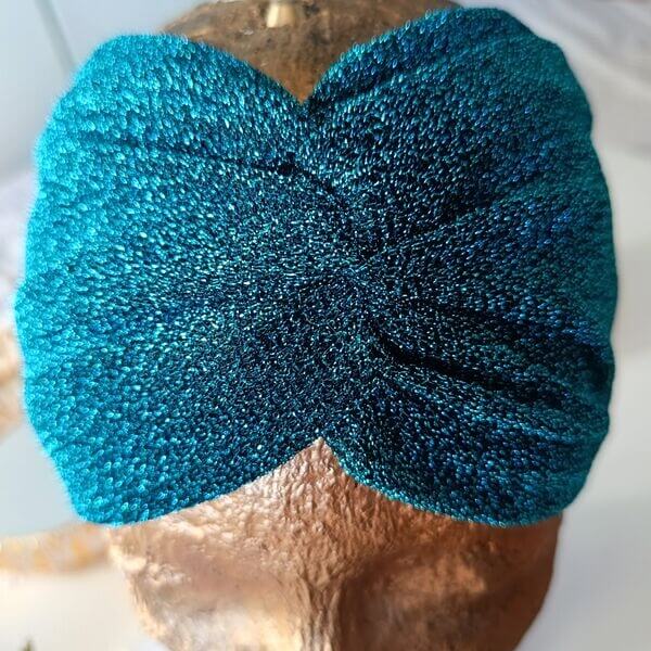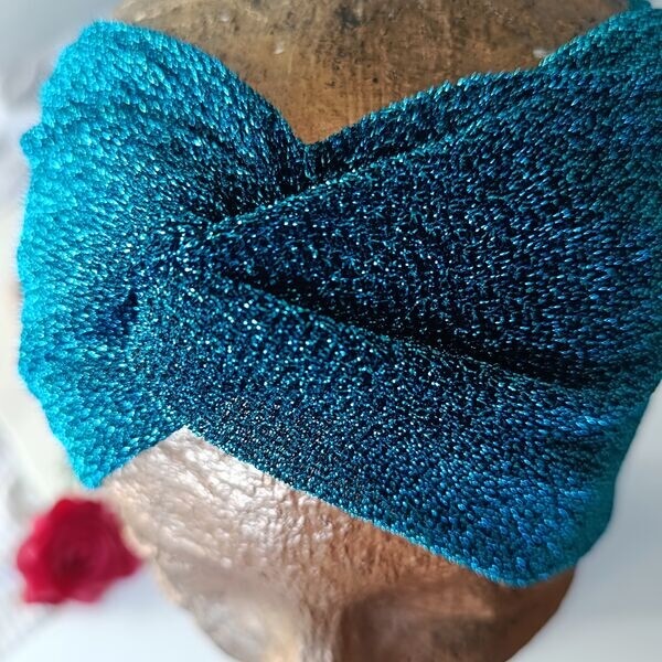 Χειροποίητη φαρδιά κορδέλα από ελαστικό ύφασμα με μεταλλιζέ κλωστή. Όλες οι χειροποίητες κορδέλες μας χρησιμοποιούνται με δύο διαφορετικούς τρόπους, είτε με τη διχάλα μπροστά, είτε φέρνοντας το πίσω μέρος μπροστά έτσι ώστε να φαίνεται πιο φαρδιά και να δίνει την εικόνα τουρμπάν