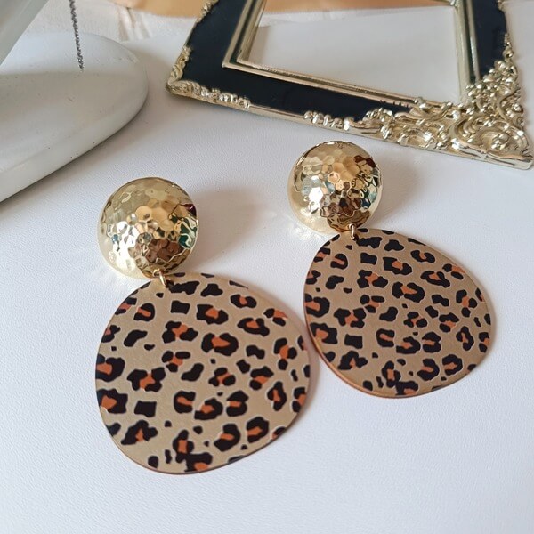 Χειροποίητα σκουλαρίκια με καρφάκι.Κάθε σκουλαρίκι αποτελείται από δύο μέρη: ένα στρογγυλό, σφυρήλατο, χρυσό καρφωτό στο επάνω μέρος και ένα μεγαλύτερο, πεπλατυσμένο οβάλ στοιχείο που κρέμεται από κάτω. Το οβάλ στοιχείο έχει σχέδιο λεοπάρ σε αποχρώσεις του καφέ, του μαύρου και του χρυσού. Εξαιρετικά ελαφριά και άνετα λόγω των υλικών κατασκευής τους.