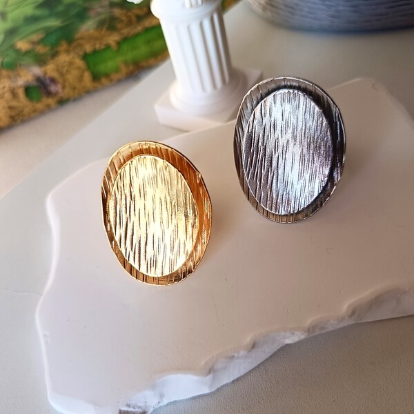 Ένα εκθαμβωτικό δαχτυλίδι από επιχρυσωμένο η επαργυρωμένο ορείχαλκο, με έντονο χαρακτήρα. Διαθέτει ένα μεγάλο, οβάλ κεντρικό στοιχείο με μοναδική, κάθετα, χαραγμένη υφή, πλαισιωμένο από έναν δεύτερο οβάλ στοιχείο. Η κάθετη ανάγλυφη χάραξη δημιουργεί οπτικό ενδιαφέρον και κίνηση. Το κλασικό οβάλ σχήμα χαρίζει κομψότητα, παρά τον statement χαρακτήρα του. Ιδανικό για όσους αγαπούν τα κοσμήματα που τραβούν την προσοχή και έχουν αρχιτεκτονική αισθητική.