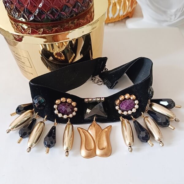 Χειροποίητο εντυπωσιακό τσόκερ, από βελούδινη τρέσα ,στολισμένη με πέτρες και χάντρες. Στην κυριολεξία μοναδικό κομμάτι καθώς έχει κατασκευασθεί μόνο ένα τεμάχιο και δεν θα επαναληφθεί!