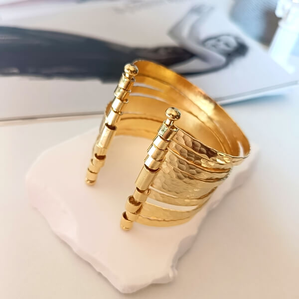 Χειροποίητο βραχιόλι κατασκευασμένο από επιχρυσωμένο ορείχαλκο. Αποτελείται από εννέα παράλληλες σειρές με σφυρήλατη υφή, οι οποίες ενώνονται στις άκρες με κάθετα στοιχεία και σφαιρικά τελειώματα. Ο σχεδιασμός του συνδυάζει την αρχαιοελληνική αίγλη με το σύγχρονο bold design.
