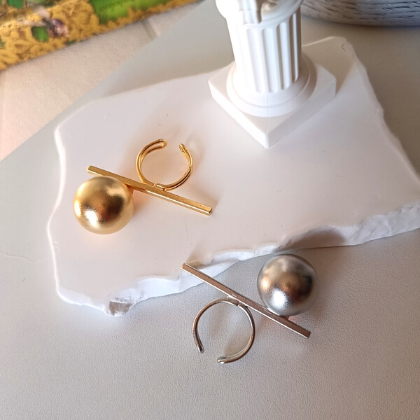 Ένα αρχιτεκτονικό, χειροποίητο  κόσμημα από επιχρυσωμένο η αντίστοιχα επαργυρωμένο ορείχαλκο, εμπνευσμένο από την τέχνη της ισορροπίας. Αυτό το statement δαχτυλίδι συνδυάζει μια μεγάλη, τρισδιάστατη  σφαίρα  με μια λεπτή ,οριζόντια ράβδο σε ένα μινιμαλιστικό design. Είναι ρυθμιζόμενο (open ring) και διατίθεται σε πλούσιο χρυσό ή μοντέρνο ασημί χρώμα. Πλούσιο, ματ φινίρισμα που  προσδίδει πολυτέλεια .Ιδανικό για ένα μοντέρνο, chic αποτέλεσμα.