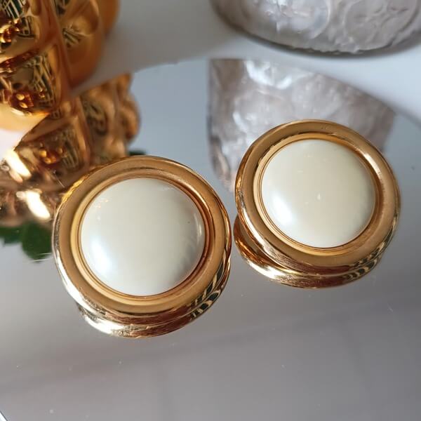 Κομψά κλιπ σκουλαρίκια με κλασικό και διαχρονικό σχέδιο. Κάθε σκουλαρίκι έχει μια κυκλική, ελαφρώς κυρτή πέτρα στο κέντρο σε μια απαλή ιβουάρ περλέ απόχρωση. Η κεντρική πέτρα περιβάλλεται από ένα πλατύ, χρυσό μεταλλικό πλαίσιο. Το πλαίσιο αποτελείται από δύο διακριτές κυκλικές ζώνες. Τα σκουλαρίκια έχουν μια εκλεπτυσμένη και διακριτική εμφάνιση, με τον κλασικό συνδυασμό του κρεμ χρώματος και του χρυσού να τους προσδίδει μια διαχρονική κομψότητα. Είναι ένα ευέλικτο αξεσουάρ που μπορεί να φορεθεί σε διάφορες περιστάσεις.