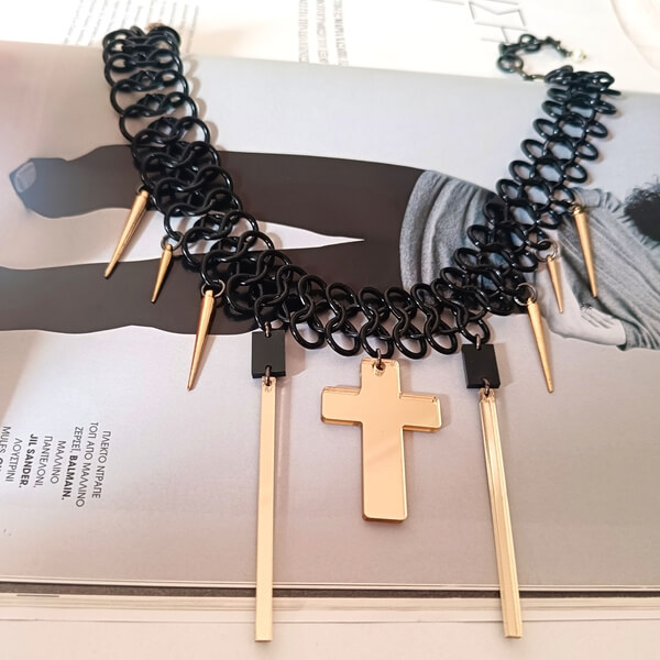 Χειροποίητο τσόκερ με γεωμετρικά στοιχεία plexiglass και σταυρό, σε απόχρωση χρυσού καθρέφτη .Πολύ ιδιαίτερο και μοναδικό αφού έχει δημιουργηθεί μόνο ένα κομμάτι. Για γυναίκες που τους αρέσει να φορούν κοσμήματα που δεν θα τα φορά κάποια άλλη καθώς είναι μοναδικό και δεν πρόκειται να επαναληφθεί