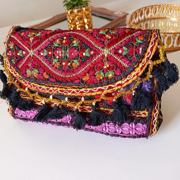 Εντυπωσιακή τσάντα clutch με κεντημένα σχέδια με ανάγλυφη υφή. Είναι διακοσμημένη με πλούσιο κέντημα, χρυσές κλωστές, κορδονάκια και μικρά λαμπερά πετραδάκια. Στο κάτω μέρος της τσάντας υπάρχουν μικρές φούντες, οι οποίες προσδίδουν μια boho και παιχνιδιάρικη αίσθηση. Ξεχωριστή, με μια έντονη έθνικ και boho αισθητική. Το πλούσιο κέντημα, οι φούντες και οι χρυσές λεπτομέρειες την καθιστούν ένα statement κομμάτι, ιδανικό για να προσθέσει μια πινελιά χρώματος και στυλ σε κάθε εμφάνιση. (Η τσάντα διαθέτει και μακρύ υφασμάτινο λουράκι)