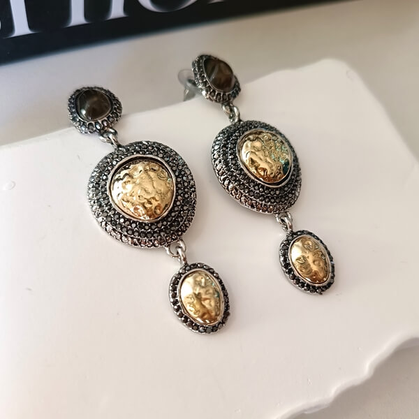 Εντυπωσιακά κρεμαστά σκουλαρίκια με καρφάκι ,σε vintage-βυζαντινό ύφος, διακοσμημένα με περίτεχνα στοιχεία σε δύο τόνους. Η βάση τους είναι ασημί με λεπτοδουλεμένες μαύρες οξειδώσεις και μικρά ζιργκόν που αναδεικνύουν την υφή, ενώ στο κέντρο φέρουν ανάγλυφα χρυσά μοτίβα .Το σχέδιο είναι τμηματικό: στο επάνω μέρος υπάρχει μια σκούρα ημιδιάφανη πέτρα , ακολουθεί ένα μεγάλο οβάλ κεντρικό στοιχείο και ολοκληρώνεται με μια μικρότερη κρεμαστή χρυσή οβάλ λεπτομέρεια.