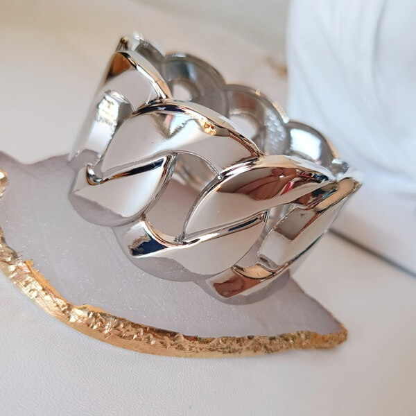 Oversized χειροπέδα σε στυλ πλατιάς αλυσίδας. Με σταθερό μέγεθος και ασφαλές κούμπωμα προσφέρει άνετη εφαρμογή και διαχρονική κομψότητα. Είναι ένα statement κόσμημα που τραβάει την προσοχή, ιδανικό να φορεθεί καθημερινά η σε ιδιαίτερες περιστάσεις.