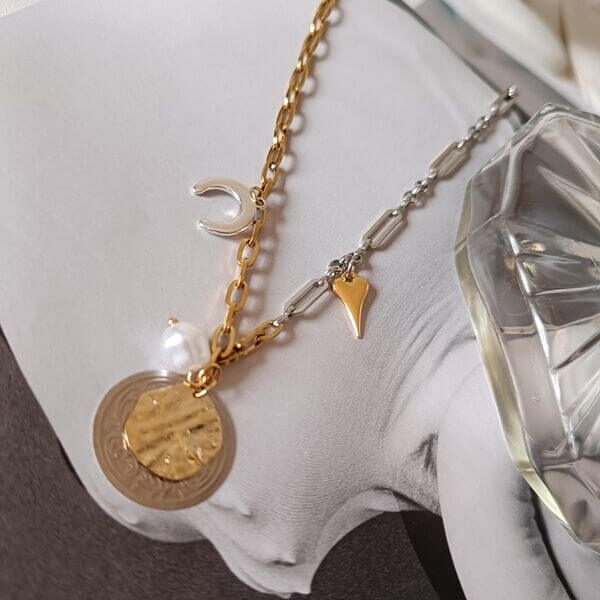 Χειροποίητο κόσμημα από ατσάλι με έντονη ασσυμετρία που συνδυάζει στοιχεία vintage, κλασικά και μοντέρνα. Δύο αλυσίδες διαφορετικού τύπου και χρώματος, συνδιασμένες με επαργυρωμένα και ατσάλινα στοιχεία.