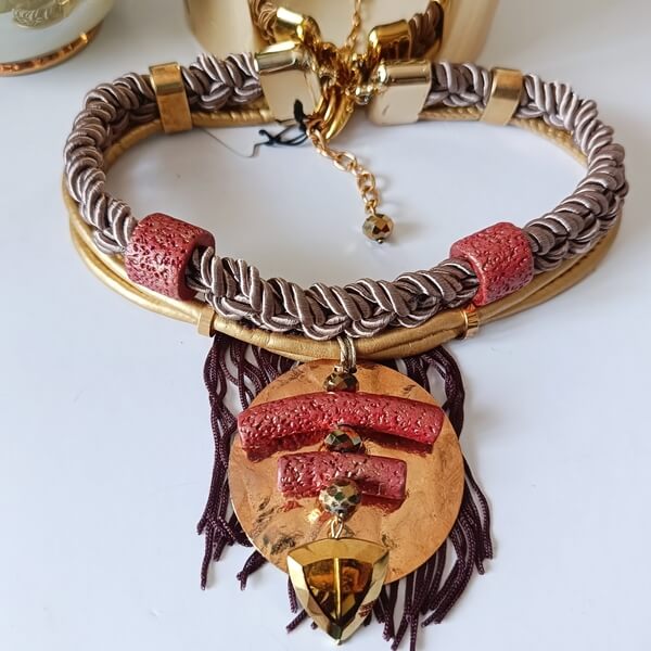 Ένα εντυπωσιακό, πολυεπίπεδο κόσμημα που συνδυάζει βιομηχανικά και παραδοσιακά υλικά με έναν τολμηρό τρόπο. Αποτελείται από δύο μέρη ενωμένα μεταξύ τους. Το πάνω μέρος είναι ένα πλεκτό χοντρό κορδόνι σε σατινέ γήινες αποχρώσεις, ενώ το κάτω είναι ένα μεταλιζέ κορδόνι με υφή δέρματος. Στο κέντρο υπάρχει ένας μεγάλος σφυρήλατος δίσκος , χάντρες από λάβα και καταλήγει ‘ένα τριγωνικό κρύσταλλο. Το κόσμημα πλαισιώνεται από κρόσσια σε καφέ χρώμα.