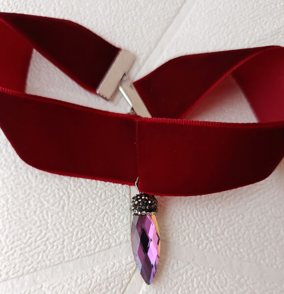 Χειροποίητο τσόκερ από βελούδινη κορδέλα και κρεμαστό κρυστάλλινο στοιχείο, με κεφαλάκι στολισμένο με μικρά ζιργκόν που από τι μια πλευρά είναι ιριδίζον και από την άλλη χρυσό