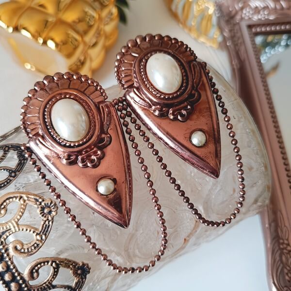 Εντυπωσιακά και περίτεχνα κλιπ σκουλαρίκια με vintage και bohemian αισθητική. Κάθε σκουλαρίκι έχει ένα σύνθετο σχέδιο σε χάλκινη απόχρωση. Το κύριο σώμα του σκουλαρικιού έχει ένα σχήμα που θυμίζει ασπίδα, με μια κυρτή, οβάλ “πέτρα” στο κέντρο σε περλέ λευκό χρώμα. Η πέτρα περιβάλλεται από ένα διακοσμητικό πλαίσιο με σκαλιστές λεπτομέρειες.Κάτω από το κύριο σώμα, υπάρχει ένα τριγωνικό ή κωνικό τμήμα με μια μικρότερη, πέτρα στο κάτω μέρος. Από αυτό το τμήμα κρέμονται λεπτές αλυσίδες με μικρές στρογγυλές χάντρες στην ίδια ροζ-χρυσή απόχρωση. Οι αλυσίδες έχουν διαφορετικά μήκη, δημιουργώντας μια αίσθηση κίνησης και πολυεπίπεδου στυλ.