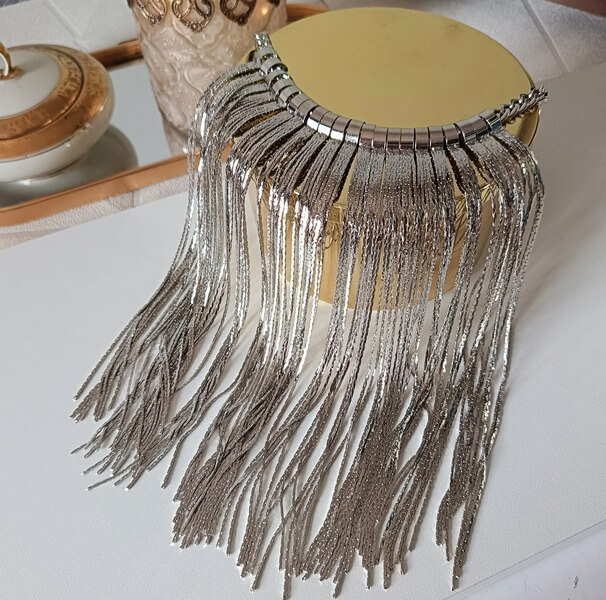 Χειροποίητο κολιέ από επαργυρωμένο ορείχαλκο ,το οποίο αποτελείται από από μια σειρά από μακριές, λαμπερές αλυσίδες που κρέμονται από μια κεντρική αλυσίδα κλασσικού τύπου. Οι αλυσίδες δημιουργούν ένα εφέ κίνησης δίνοντας στο κόσμημα μια δυναμική και μοντέρνα εμφάνιση. Ταιριάζουν τέλεια σε ένα boho chic ή grunge στυλ, αλλά μπορούν επίσης να φορεθούν και με πιο επίσημα ρούχα για να προσθέσουν μια δόση ατομικότητας