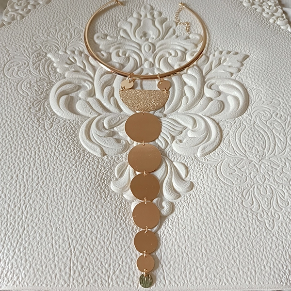 Μεταλλικό τσόκερ με σειρά γεωμετρικών στοιχείων.Κατάλληλο να φορεθεί με μπλούζες που έχουν βαθύ ντεκολτέ ,πάνω από ζιβάγκο η μέσα από σακάκι.Δεν έχει κούμπωμα,ανοιγοκλείνει και προσαρμόζεται σε όλες τις διαστάσεις