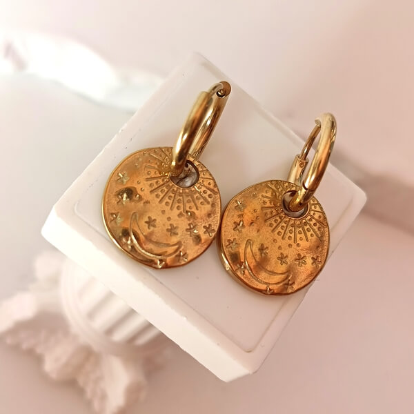 Ατσάλινοι κρίκοι από τους οποίους κρέμεται ένα ανάγλυφο νόμισμα, πάνω στο οποίο είναι χαραγμένα ουράνια σύμβολα. Το φινίρισμα που έχουν είναι ελαφρώς “παλαιωμένο” χρυσό , δίνοντας την αίσθηση οικογενειακού κειμηλίου.