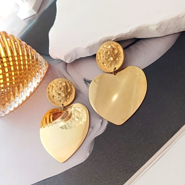 Χειροποίητα σκουλαρίκια από ανοξείδωτο χάλυβα. Αποτελείται από μια στρογγυλή βάση με σφυρήλατο φινίρισμα. Η ανώμαλη επιφάνειά της αντανακλά το φως με έναν ιδιαίτερο, οργανικό τρόπο, δίνοντας την αίσθηση του χειροποίητου. Από κάτω κρέμεται μία μεγάλη χρυσή καρδιά . Η αντίθεση ανάμεσα στη σφυρήλατη βάση και τη γυαλιστερή επιφάνεια της καρδιάς δημιουργεί ένα ενδιαφέρον οπτικό παιχνίδι. Είναι τολμηρά (statement) αλλά ταυτόχρονα κομψά, θυμίζοντας κοσμήματα από τη δεκαετία του ’80 που έχουν επανασχεδιαστεί για τη σύγχρονη γυναίκα.