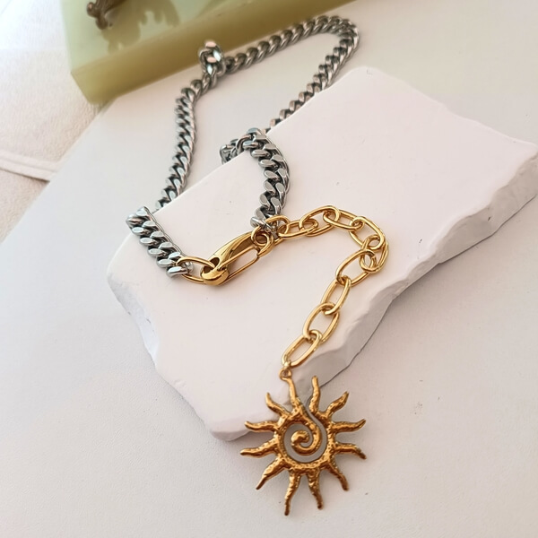 Χειροποίητο mixed metal κολιέ από ανοξείδωτο ατσάλι. Παρουσιάζει μια εντυπωσιακή αντίθεση δύο διαφορετικών τύπων αλυσίδας. Η μία πλευρά αποτελείται από μια στιβαρή, πλακέ αλυσίδα, που προσδίδει έναν πιο rock χαρακτήρα. Η άλλη πλευρά μεταβαίνει σε μια χρυσή αλυσίδα με ανοιχτούς κρίκους (oval link chain), προσθέτοντας φως και μια πιο κλασική αίσθηση. Το κεντρικό στοιχείο είναι ένας ανάγλυφος, ήλιος σε χρυσό χρώμα. Στο κέντρο του φέρει το σύμβολο της σπείρας, που παραπέμπει στην αέναη κίνηση, τη ζωή και την αρχαιοελληνική παράδοση.