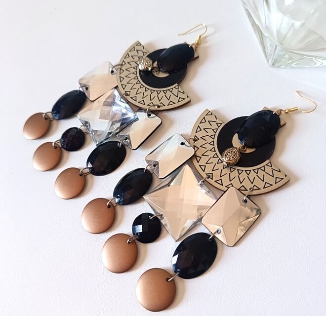 Χειροποίητα κρεμαστά σκουλαρίκια με έντονο boho-Glam στυλ. Ημικυκλική βάση, με γεωμετρικό ξύλινο μοτίβο από το οποίο κρέμονται διάφορα στοιχεία σε λαμπερά και ματ φινιρίσματα. Μοντέρνο κόσμημα ,ιδανικό για να είναι το κεντρικό σημείο του συνόλου (focal point).