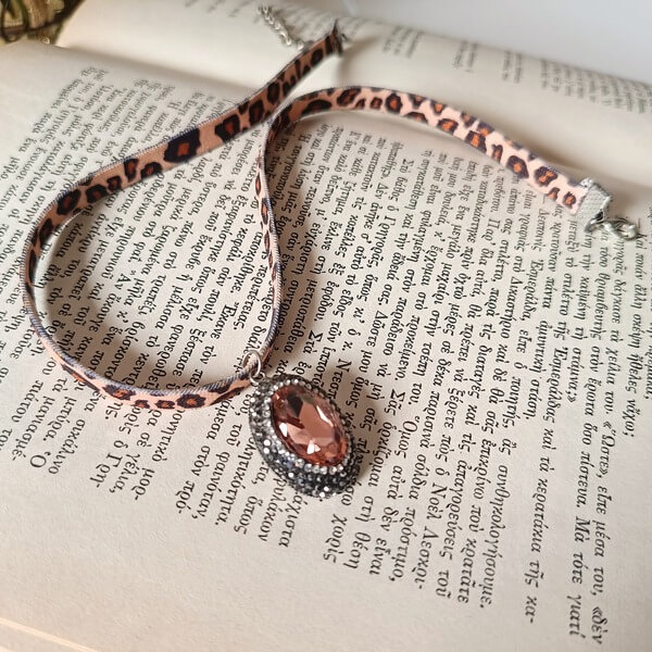 Χειροποίητο τσόκερ, από ελαστικό animal print κορδόνι και κρεμαστό στοιχείο με κρυστάλλινη αστραφτερή πέτρα που διακοσμείται όλη με μικρά ζιργκόν
