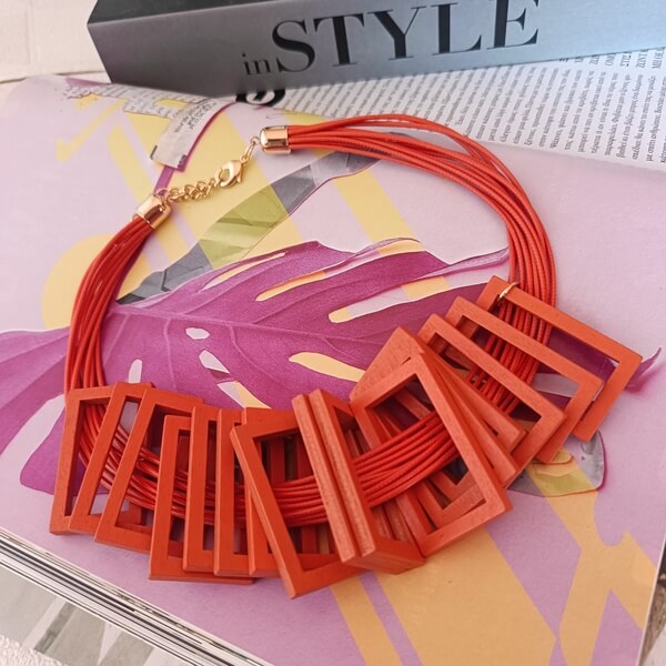Ένα εντυπωσιακό δείγμα σύγχρονου γεωμετρικού σχεδιασμού με έντονη καλλιτεχνική αύρα. Αποτελεί ένα “statement” κομμάτι που συνδυάζει την αυστηρότητα των σχημάτων με την ελευθερία της κίνησης. Το κολιέ αποτελείται από πολλαπλά, μαύρα παραλληλόγραμμα πλαίσια από ξύλο, περασμένα μέσα από μια δέσμη κορδονιών. Τα πλαίσια είναι τοποθετημένα έτσι ώστε να επικαλύπτονται, δημιουργώντας ένα δυναμικό, τρισδιάστατο αποτέλεσμα. Διαθέτει χρυσά μεταλλικά τελειώματα και αλυσίδα αυξομείωσης στο πίσω μέρος, προσθέτοντας μια διακριτική πινελιά πολυτέλειας στη συνολική minimal αισθητική.