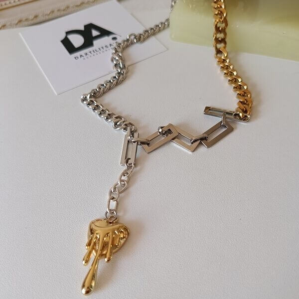 Χειροποίητο κόσμημα από ατσάλι. Αποτελείται από 3 διαφορετικά είδη αλυσίδας, με κεντρικό στοιχείο ένα παιχνιδιάρικο και εντυπωσιακό μενταγιόν. Ένα κολιέ σε τολμηρό, σύγχρονο σχέδιο αρκετά εντυπωσιακό.