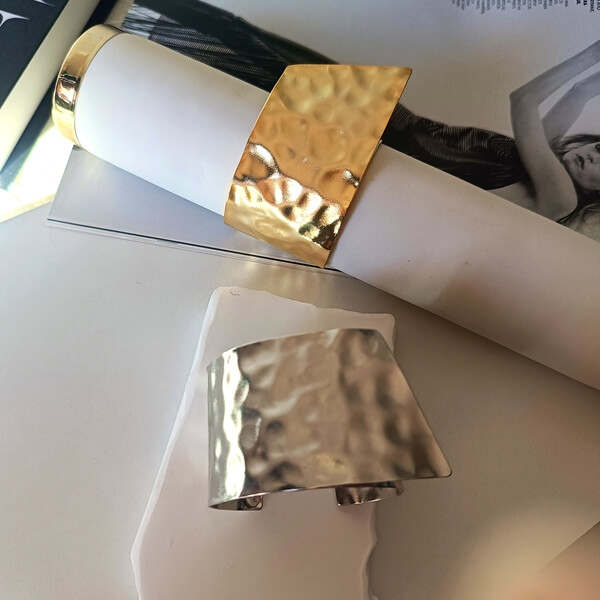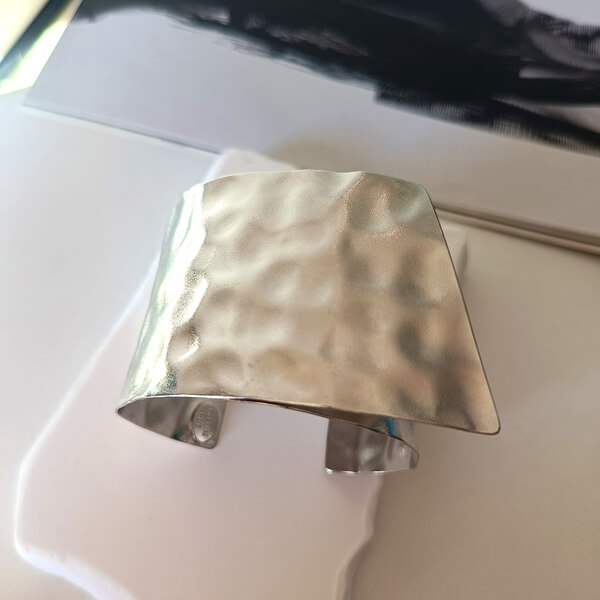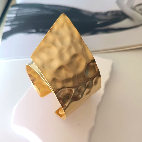 Χειροποίητο βραχιόλι κατασκευασμένο από επιχρυσωμένο η επαργυρωμένο ορείχαλκο, με έντονα σφυρήλατη επιφάνεια που δημιουργεί οργανικές κυματιστές ανακλάσεις. Το σχήμα του είναι ασύμμετρο , δίνοντας μια αίσθηση “γλυπτού” στον καρπό. Η εσωτερική του πλευρά είναι λεία, εξασφαλίζοντας άνεση, ενώ το ανοιχτό του πίσω μέρος επιτρέπει την εύκολη εφαρμογή. Ιδανικό για γυναίκες που αγαπούν τα μεγάλα, επιβλητικά αξεσουάρ.