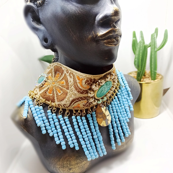 Χειροποίητο τσόκερ κατασκευασμένο από τρέσα διακοσμημένη με γυάλινες και ακρυλικές πέτρες και πλούσια σύνθεση από πολύ μικρές γυάλινες χάντρες .Η απόλυτη τάση του καλοκαιριού!