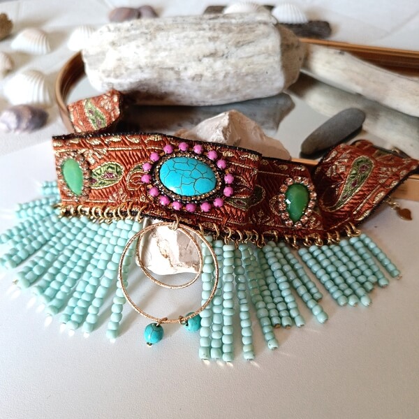 Χειροποίητο τσόκερ κατασκευασμένο από γυάλινες και ακρυλικες πέτρες, χρωματιστά στρας και πλούσια σύνθεση από πολύ μικρες χάντρες με μεταλλικό γεωμετρικό στοιχείο στο κέντρο