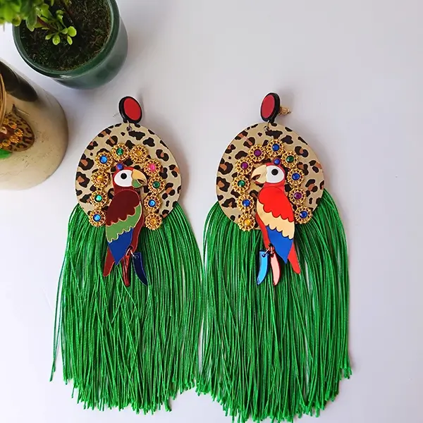 Σκουλαρίκια καρφωτά με ξύλινο λεοπάρ μοτίφ ,στοιχεία plexiglass,τρέσα με χρωματιστές πετρούλες και μακρυά κρόσσια.Ανάλαφρα ,προσδίδουν μια καλοκαιρινή αύρα και ταιριάζουν απόλυτα με boho στυλιστικές επιλογές