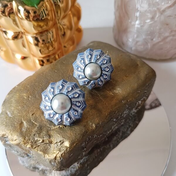 Κομψά και περίτεχνα σκουλαρίκια με κλιπ, από πηλό ,σε ένα σχέδιο που θυμίζει αστέρι. Κάθε σκουλαρίκι έχει ένα κεντρικό, στρογγυλό μαργαριτάρι σε απαλή, ιριδίζουσα γκρι-λευκή απόχρωση. Το εξωτερικό πλαίσιο είναι διαμορφωμένο σε ένα πολυγωνικό αστεροειδές σχήμα σε γκριζομπλέ απόχρωση, με λεπτές ασημί γραμμές που δημιουργούν γεωμετρικά μοτίβα και τονίζουν τις ακτίνες, προσδίδοντας ένα art deco ή vintage χαρακτήρα.