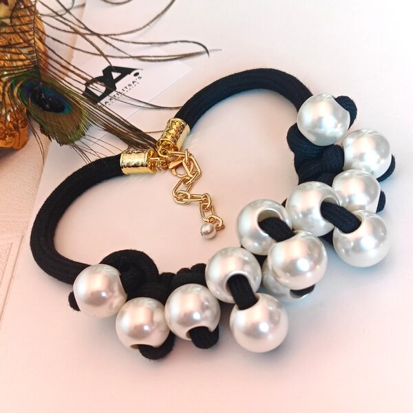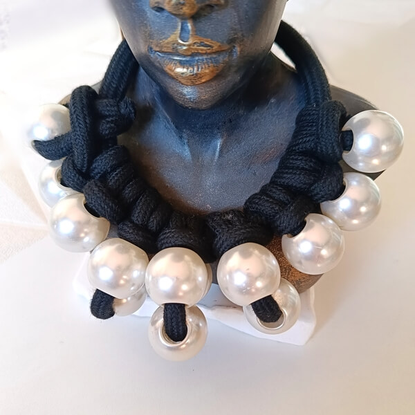 Ένα ιδιαίτερο κομμάτι που συνδυάζει το κλασικό στοιχείο της πέρλας με μια πιο μοντέρνα, “industrial” αισθητική λόγω των υλικών του.Αποτελείται από χοντρό μαύρο κορδόνι   το οποίο είναι πλεγμένο με κόμπους. Φέρει μεγάλες, γυαλιστερές πέρλες με ευδιάκριτες τρύπες, περασμένες ανάμεσα στους κόμπους, δημιουργώντας ένα τρισδιάστατο και πλούσιο αποτέλεσμα. Διαθέτει μεταλλικά κουμπώματα  και  αλυσίδα προέκτασης για αυξομείωση του μήκους, που καταλήγει σε μια μικρή διακοσμητική πέρλα.