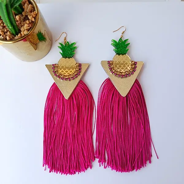 Δερμάτινα χειροποίητα κρεμαστά σκουλαρίκια σε απαλό χρυσό χρώμα,διακοσμημένα με χρωματιστά λαμπερά στρας, στοιχεία plexiglass και μακρυά κρόσσια.Ανάλαφρη κατασκευή ,μπορουν να φορεθούν όλες τις ώρες της ημέρας