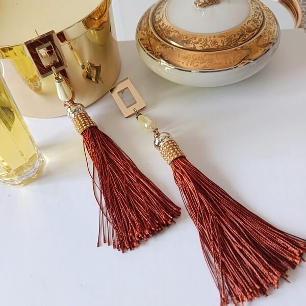 Χειροποίητα σκουλαρίκια με καρφάκι μακριές φούντες διακοσμημένες με δερμάτινη λεπτή τρέσα με τρουκς, πέρλες και πλεξιγκλάς