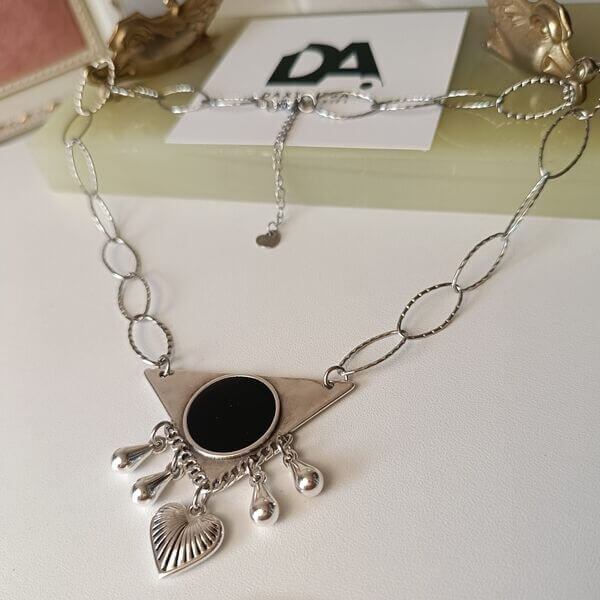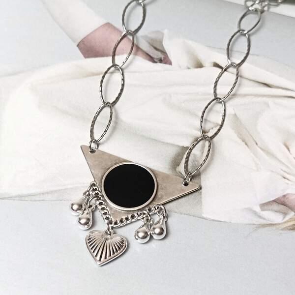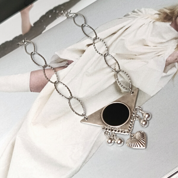 Χειροποίητο μενταγιόν με ατσάλινη σφυρήλατη αλυσίδα και γεωμετρικό επαργυρωμένο στοιχείο, με σμάλτο και μικρά διακοσμητικά charms