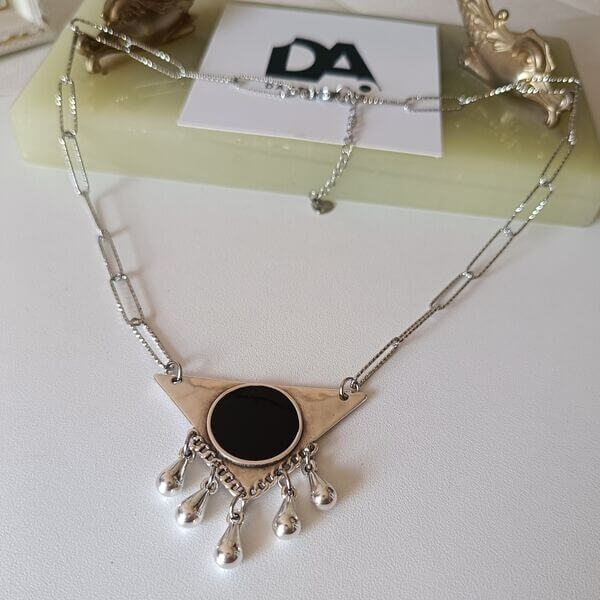 Χειροποίητο μενταγιόν με ατσάλινη σφυρήλατη αλυσίδα και γεωμετρικό επαργυρωμένο στοιχείο, με σμάλτο και μικρά διακοσμητικά charms