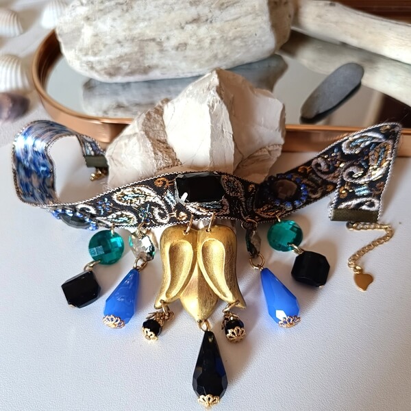 Χειροποίητο τσόκερ με τρέσσα στολισμένη με διάφορες πέτρες,στρας και κρεμαστή σύνθεση από κρυστάλινα και μεταλλικά στοιχεία