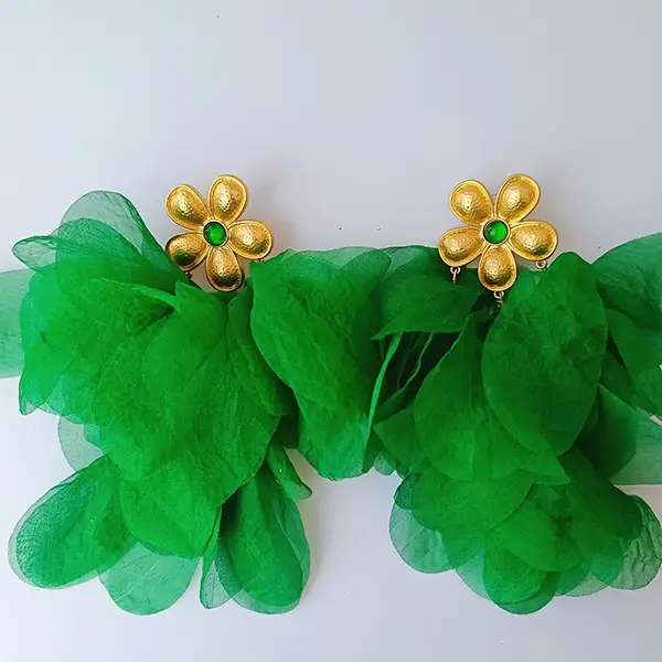 Σκουλαρίκια καρφωτά με βάση μεταλλικό χρυσό λουλούδι με πράσινη χάντρα στο κέντρο και σκελετό από γιάλινες ημιδιάφανες χάντρες ,στον οποίο έχουν προσαρμοστεί φύλλα από μουσελίνα.Απλό και μίνιμαλ και συνάμα πολύ εντυπωσιακό και ελαφρύ σχέδιο