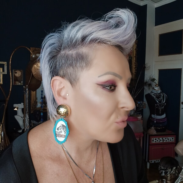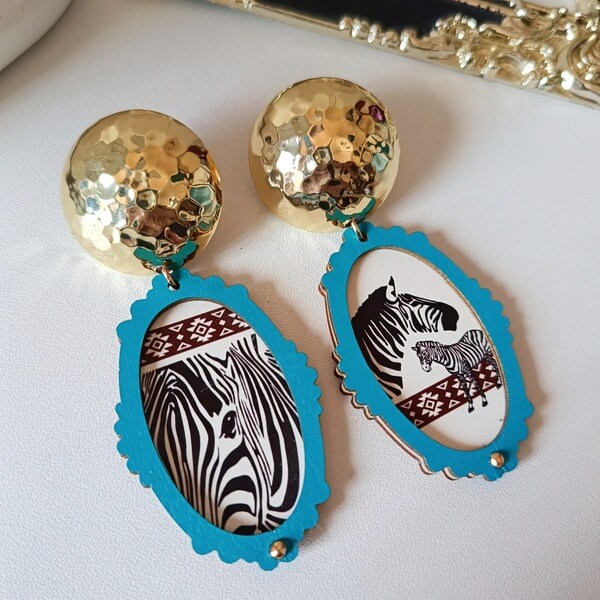 Χειροποίητα boho σκουλαρίκια με καρφάκι. Κάθε σκουλαρίκι αποτελείται από ένα σφυρήλατο, χρυσό στοιχείο στο επάνω μέρος. Από κάτω κρέμεται ένα οβάλ ξύλινο σε έντονο τιρκουάζ χρώμα με διακοσμητικές κυματιστές άκρες και μικρές χρυσές λεπτομέρειες. Μέσα στο πλαίσιο υπάρχει μια εικόνα που απεικονίζει ζέβρες σε ασπρόμαυρο φόντο, το οποίο φέρει επίσης ένα διακριτικό γεωμετρικό μοτίβο σε καφέ και λευκό.